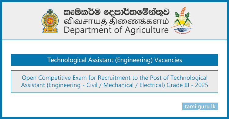 Calling for Applications – Open Competitive Examination for Recruitment to the Post of Technological Assistant (Engineering – Civil / Mechanical / Electrical) Grade III in the Department of Agriculture – 2025