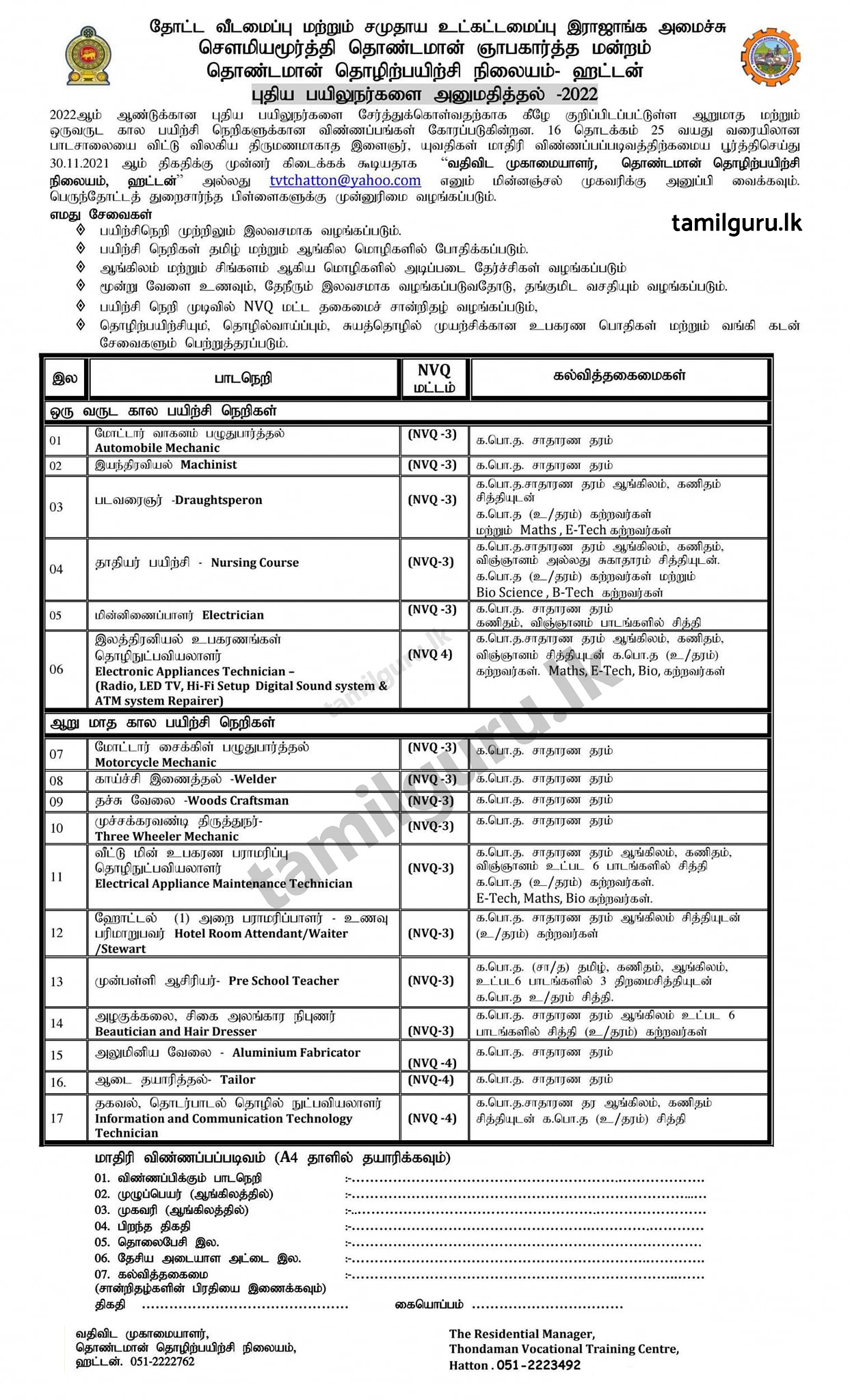 ஹட்டன் தொண்டமான் தொழிற்பயிற்சி நிலையத்தின் 2022 ஆம் ஆண்டிற்கான இலவச கற்கை நெறிகளுக்கு புதிய மாணவர்களை அனுமதிப்பதற்காக விண்ணப்பங்கள் கோரப்படுகிறது
