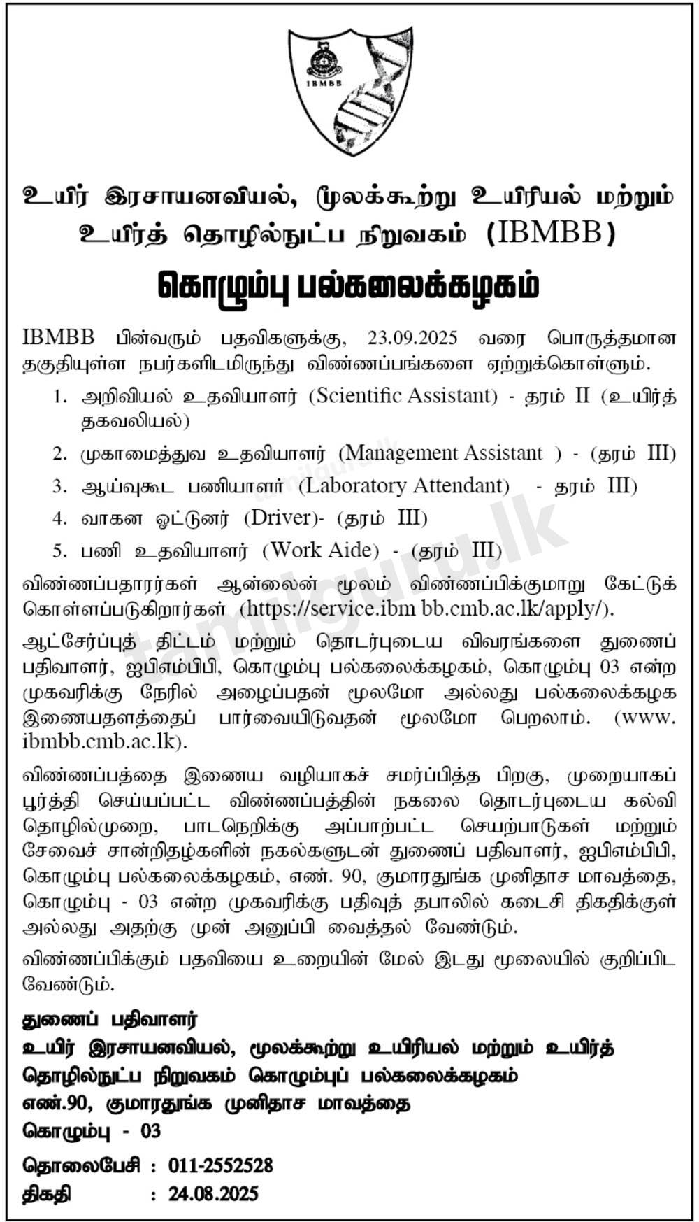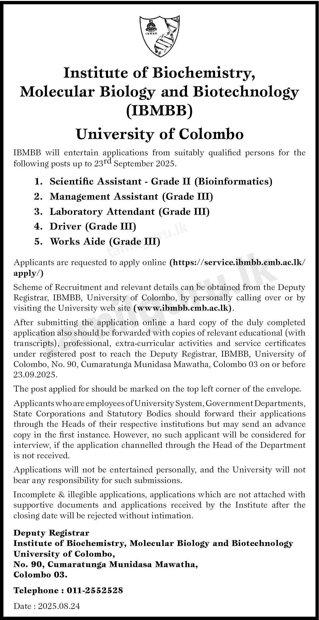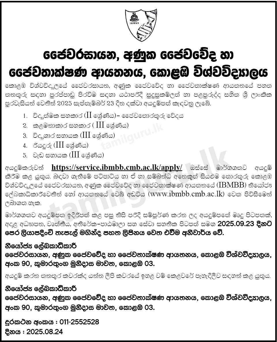 Job Vacancies at Institute of Biochemistry, Molecular Biology and Biotechnology (IBMBB), University of Colombo - 2025 August / September