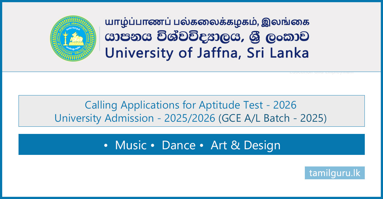 The University of Jaffna has officially called for applications for aptitude tests required to select candidates for Bachelor of Fine Arts Honours in Music, Dance, and Art & Design Degree Programmes for the 2025/2026 academic year, based on the GCE A/L Examination 2025 results.