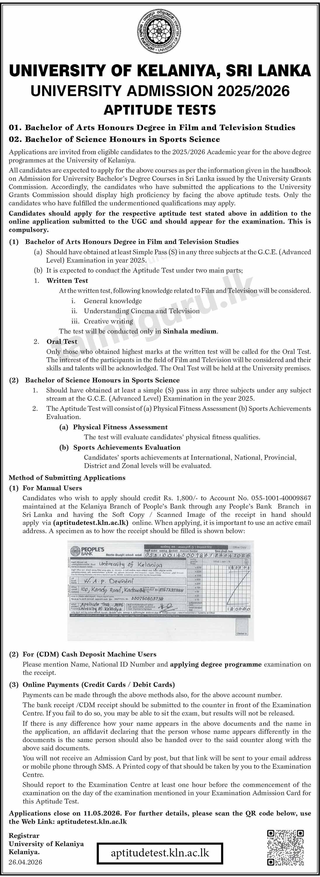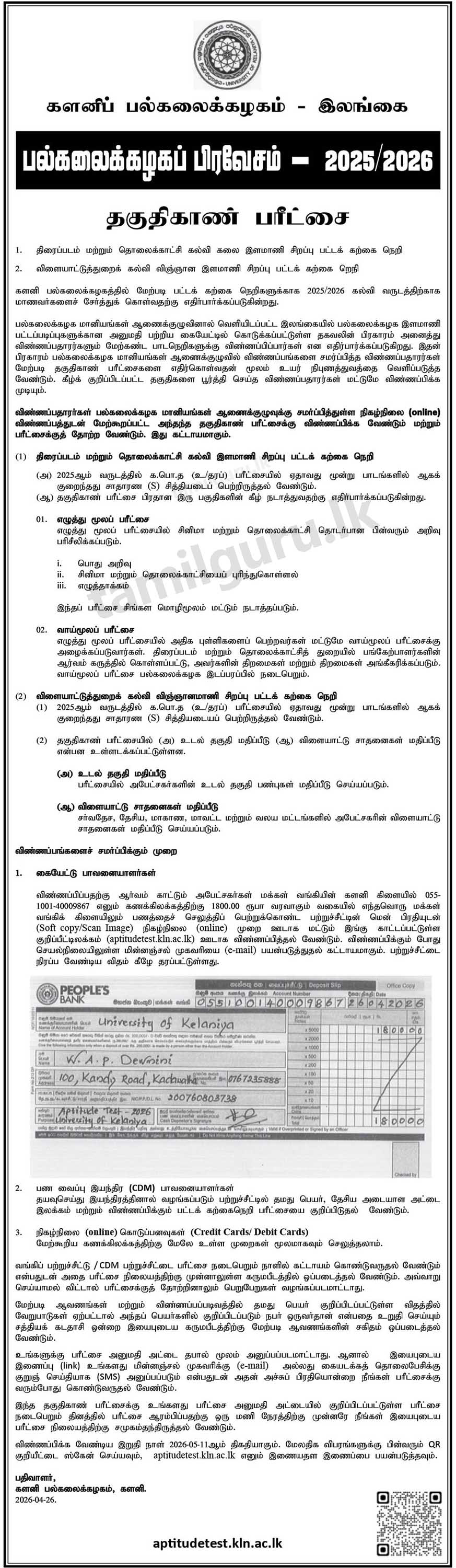 - Apply online via: https://aptitudetest.kln.ac.lk/