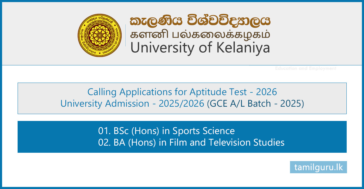 The University of Kelaniya has officially called for applications for aptitude tests required to select candidates for the degree programmes under the 2025/2026 academic year, based on the GCE A/L Examination 2025 results.
