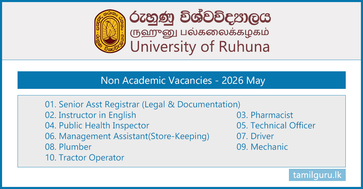 The University of Ruhuna has invited applications from suitably qualified candidates for several non-academic staff vacancies. Interested applicants must submit their applications on or before 05 May 2026 through the official online application portal.