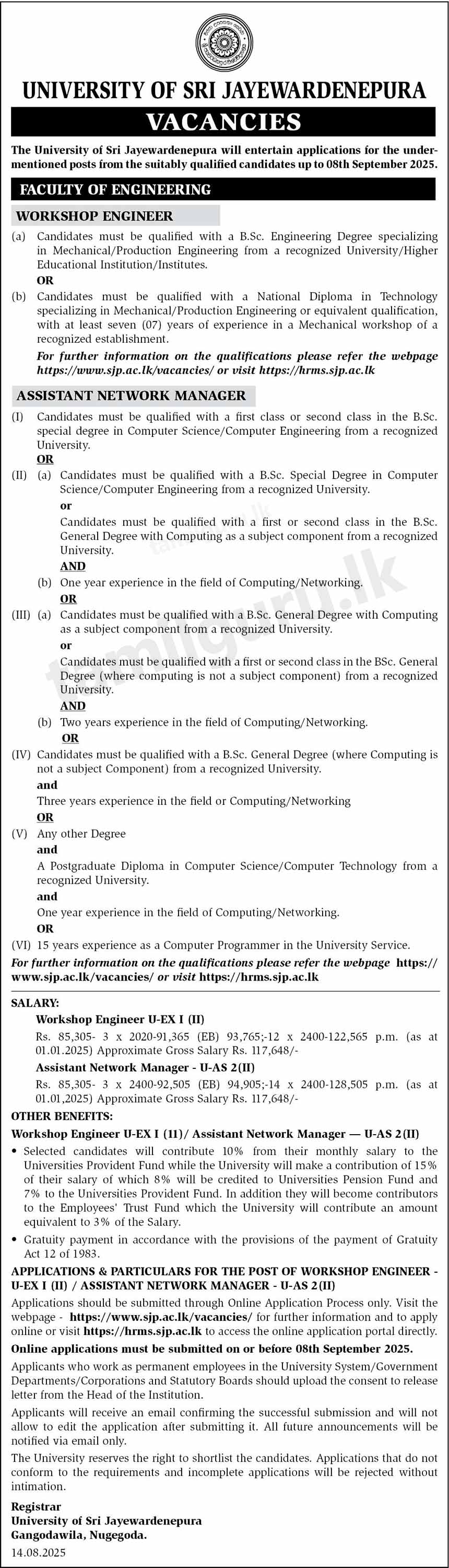 Job Vacancies at University of Sri Jayewardenepura – 2025 August / September