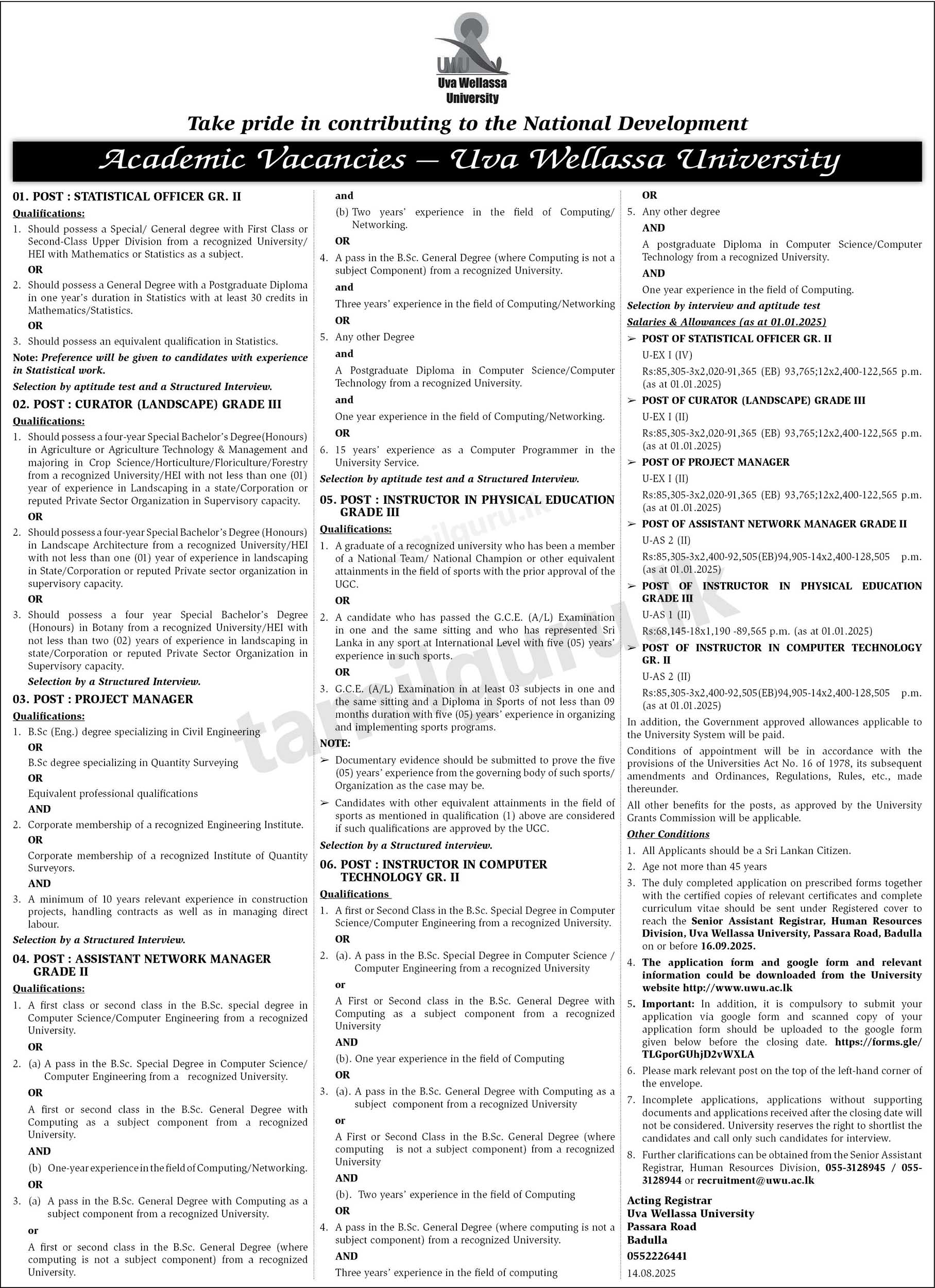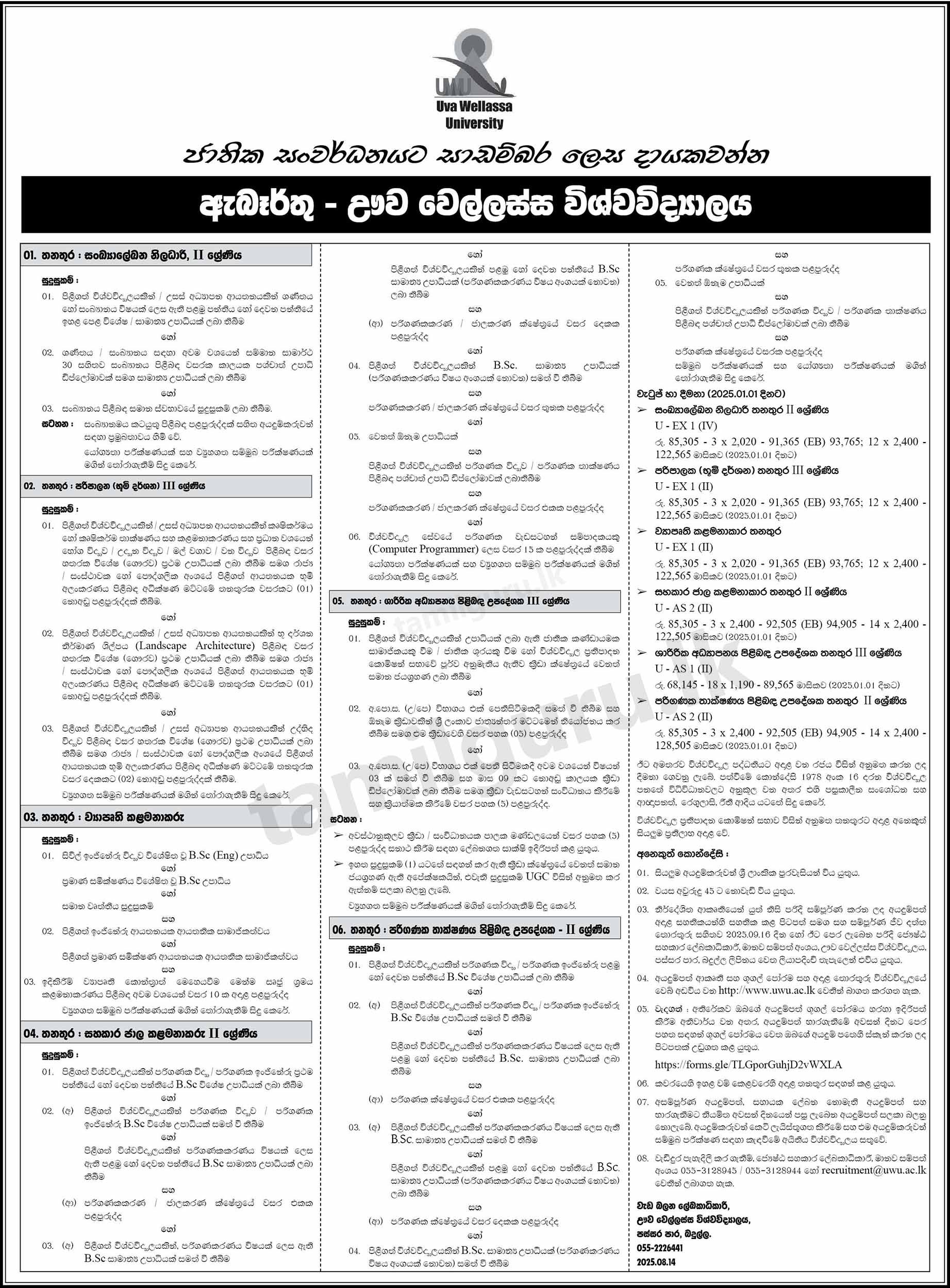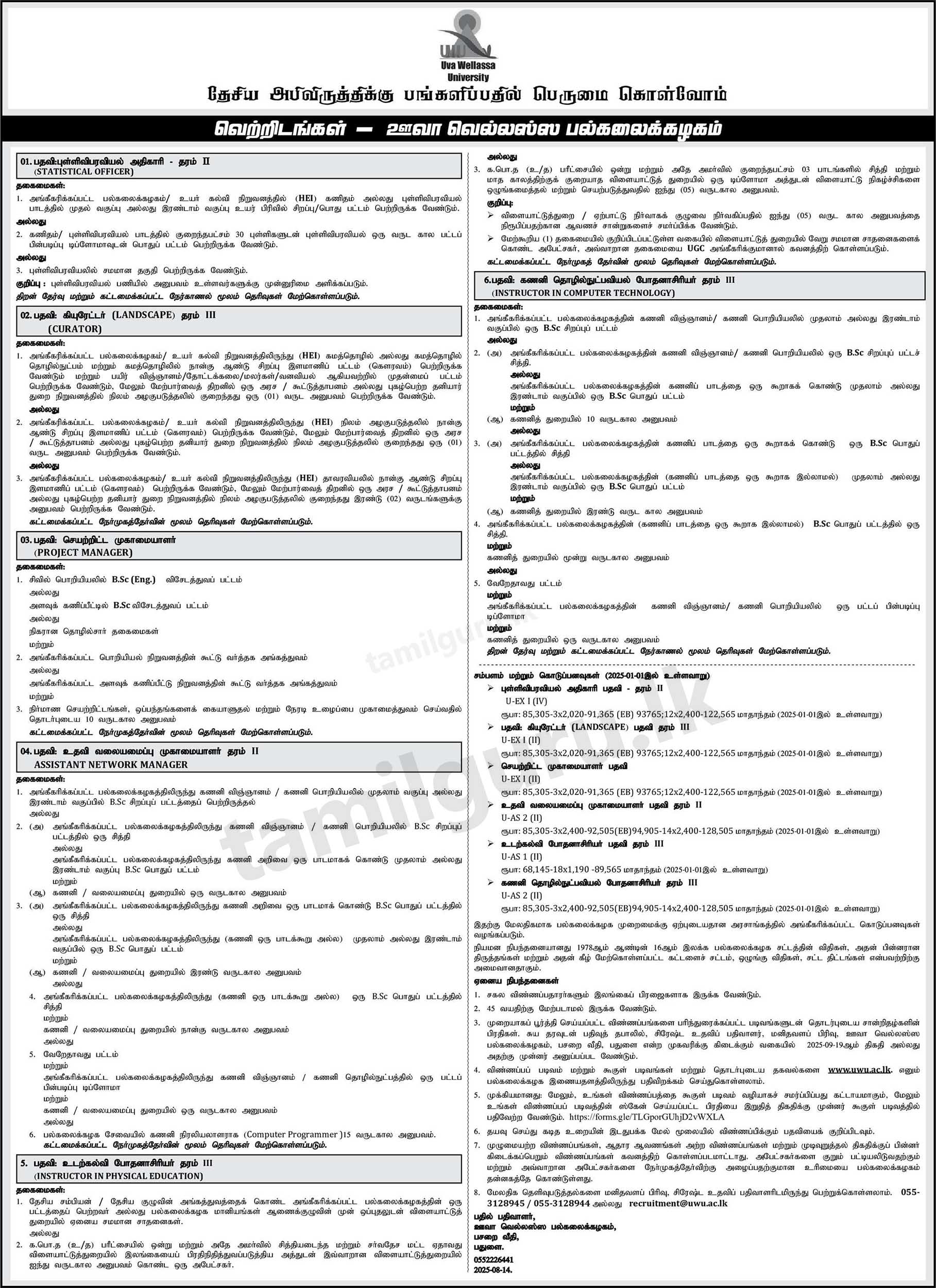 Job Vacancies at Uva Wellassa University – 2025 August / September