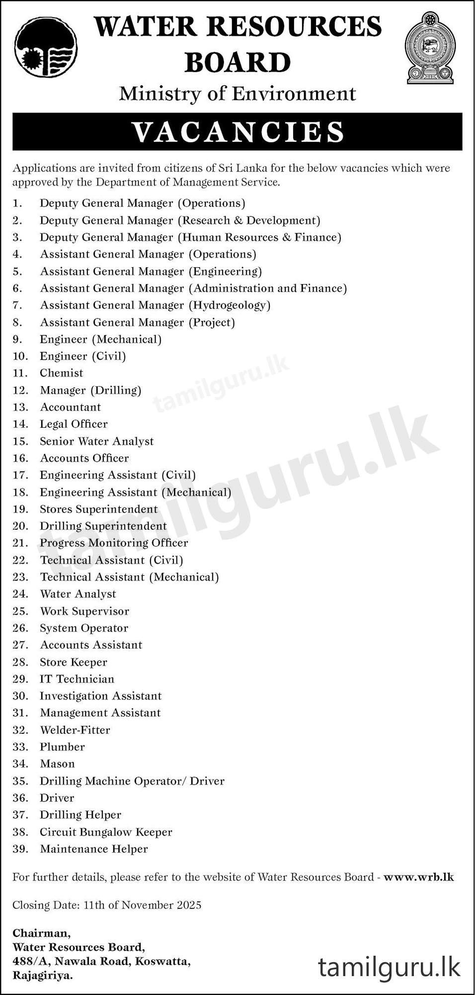 Job Vacancies at Water Resources Board, Ministry of Environment – 2025 November